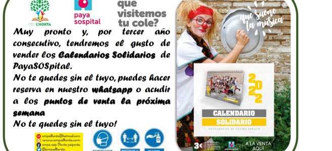 Por tercer año consecutivo, la Comisión AMPA solidaria coordina la venta de calendarios de la ONG PayaSOSpital. Este complicado año, las niñas y niños hospitalizados necesitan más que nunca esa alegría que los payasos y payasas de esta ONG les llevan a sus habitaciones de hospital. El precio de cada calendario es de 3€ y van íntegros … Sigue leyendo Campaña solidaria con PayaSOSpital