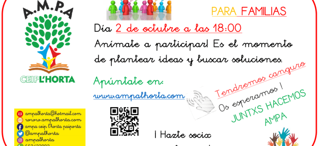 Se convoca Asamblea General Extraordinaria de la Asociación de Madres y Padres de Alumnas/os del CEIP L'Horta a celebrar el miércoles 26 de mayo de 2021 a las 18:30 h en primera convocatoria y a las 18:45 h en segunda convocatoria, en el patio del colegio, con el siguiente Orden del día: Lectura y aprobación, … Sigue leyendo Convocatoria Asamblea General Ordinaria