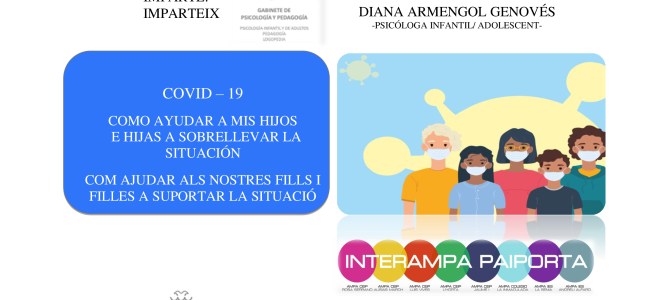 Hemos recibido desde diferentes madres y padres la necesidad de una formación para dotarlas de herramientas a la hora de ayudar a sus hijas e hijos durante esta pandemia. Debido a esto, InterAMPA junto al Gabinete de Psicología y Pedagogía ADI de Paiporta, os presentamos este taller con el título "COVID-19: Cómo ayudar a mis … Sigue leyendo Formación «COVID-19: Cómo ayudar a mis hijos e hijas a sobrellevar la situación»