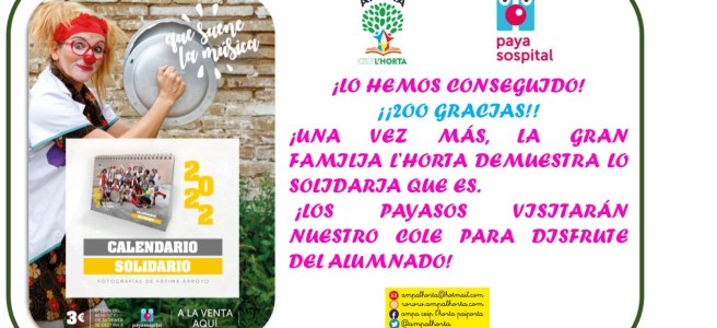 Otro año más (y ya van 3), las familias de L'Horta demuestran su solidaridad con la ONG PayaSOSpital y se han vendido 200 calendarios. Gracias a esta venta, PayaSOSpital nos visitará un día y hará reír a nuestras niñas y niños. ¡Muchas gracias por vuestra solidaridad!