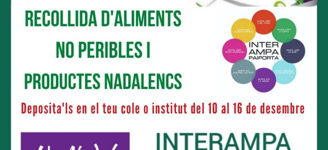 Este año nos hemos sumado a InterAMPA en la recogida de alimentos y productos no perecederos que se entregarán a Cruz Roja-Paiporta y Cáritas-Paiporta. Si quieres colaborar, durante esta semana (del 13 al 17 de diciembre), trae los productos al cole y entrega a la tutora/tutor de vuestra hija/o. ¡Muchas gracias por vuestra colaboración! Si … Sigue leyendo Recogida solidaria de alimentos y productos no perecederos