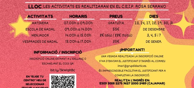 Os presentamos la escoleta de Navidad 2021 que organizat InterAMPA junto al Ayuntamiento. La escoleta se realizará en las instalaciones del CEIP Rosa Serrano, en el centro de Paiporta. Este año ofertamos los 11 días no lectivos de las vacaciones de Navidad en los colegios. Más abajo podéis encontrar el enlace para realizar la inscripción … Sigue leyendo Escoleta de Navidad 2021