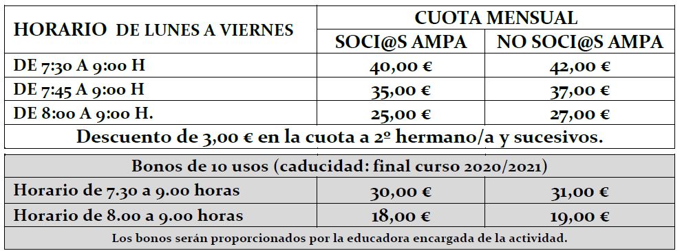 Los precios según el horario de entrada y asociación o no a AMPA, son: