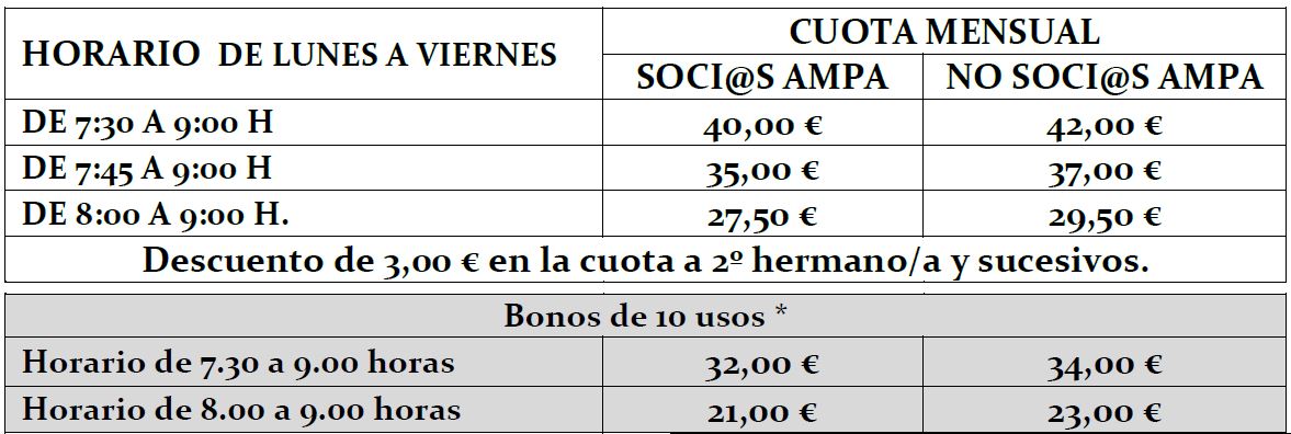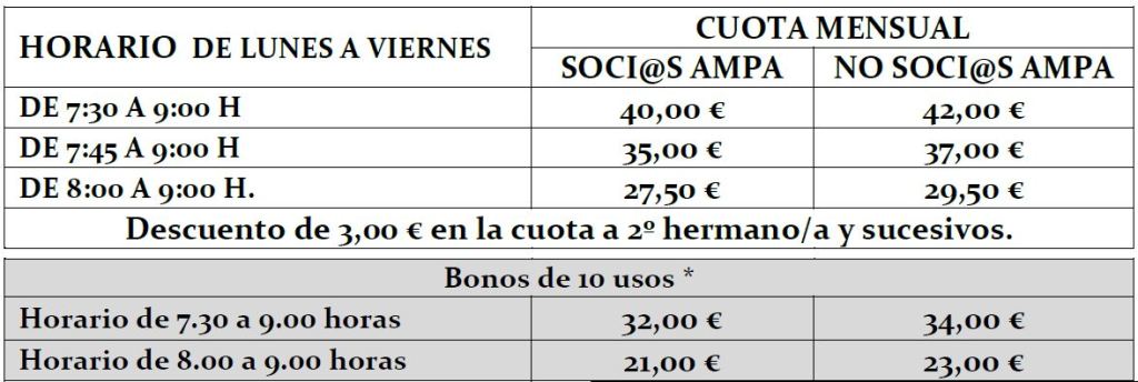 Los precios según el horario de entrada y asociación o no a AMPA, son: