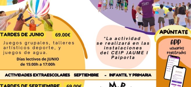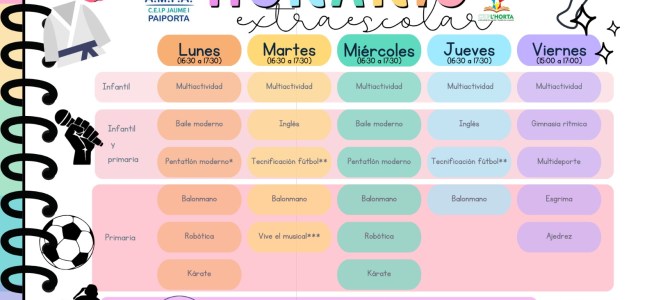 Ya tenemos preparadas las actividades extraescolares para que las familias podáis conciliar desde octubre del 2025 hasta mayo del 2026. Este curso compartiremos las actividades con la AMPA del CEIP Jaume I. En los siguientes enlaces podéis encontrar las hojas o links de inscripción. Para formalizar la inscripción, enviadnos por correo (ampalhorta@hotmail.com) o por whatsapp … Sigue leyendo Actividades extraescolares 2025-2026